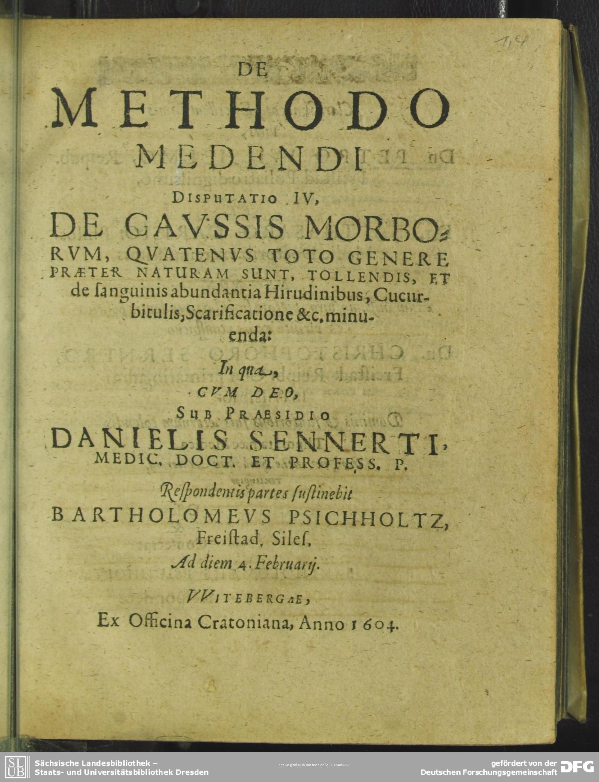 De Methodo Medendi Disputatio IV : De Caussis Morborum, Quatenus Toto Genere Praeter Naturam Sunt, Tollendis, Et de sanguinis abundantia Hirudinibus, Cucurbitulis, Scarificatione &c. minuenda (1604)