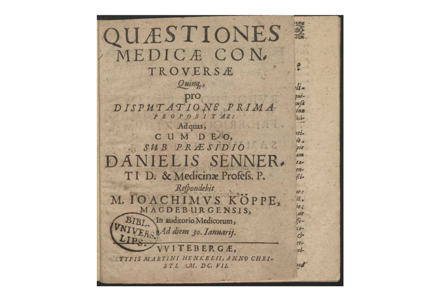 Quaestiones Medicae Controversae Quinque, Pro Disputatione Prima Propositae / Ad quas, Cum Deo, Sub Praesidio Danielis Sennerti D. & Medicinae profess. P. Respondebit M. Joachimus Köppe, Magdeburgensis, In auditorio Medicorum, Ad diem 30. Januarii.