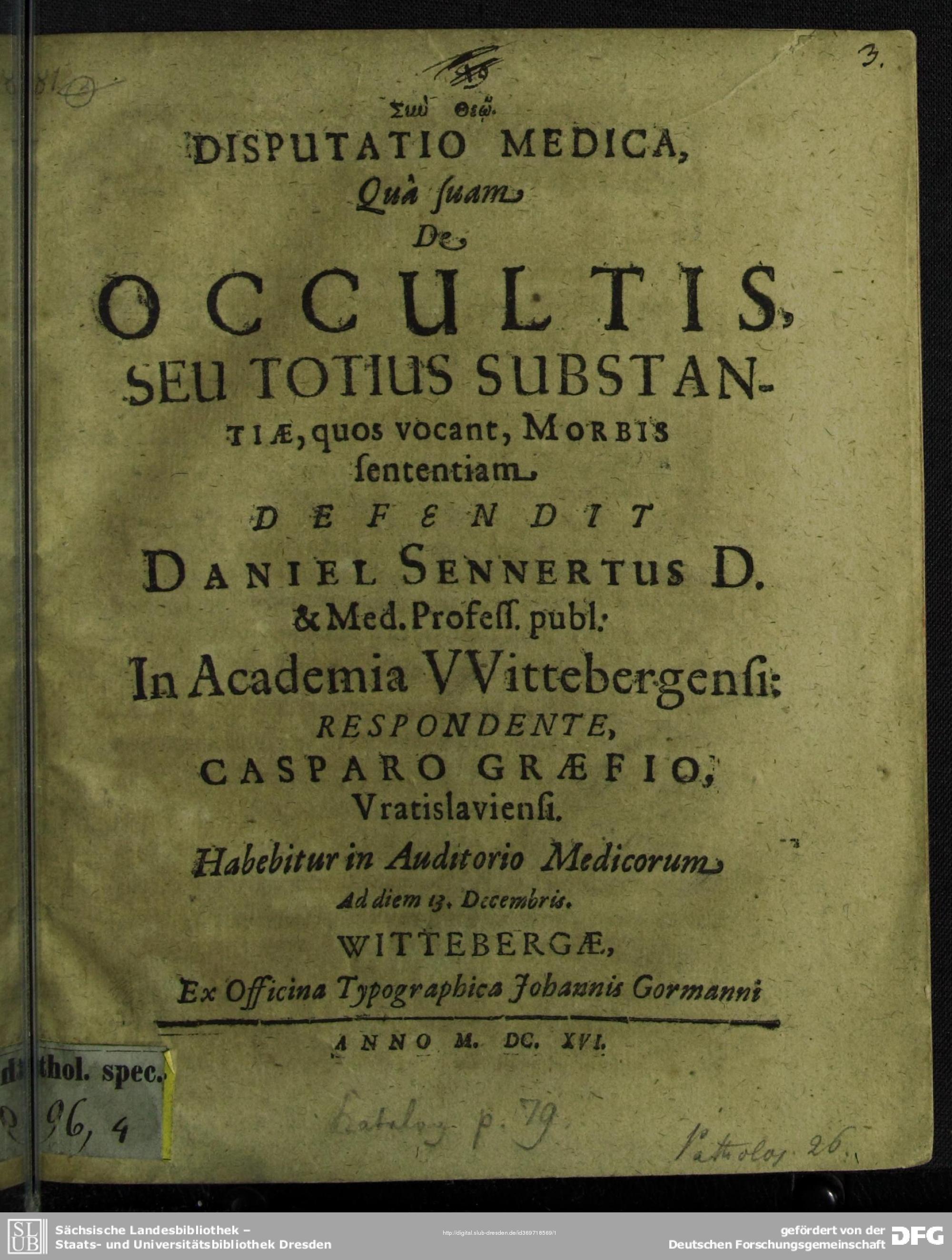 Disputatio Medica, Qua suam De Occultis, Seu Totius Substantiae, quos vocant, Morbis sententiam (1616)