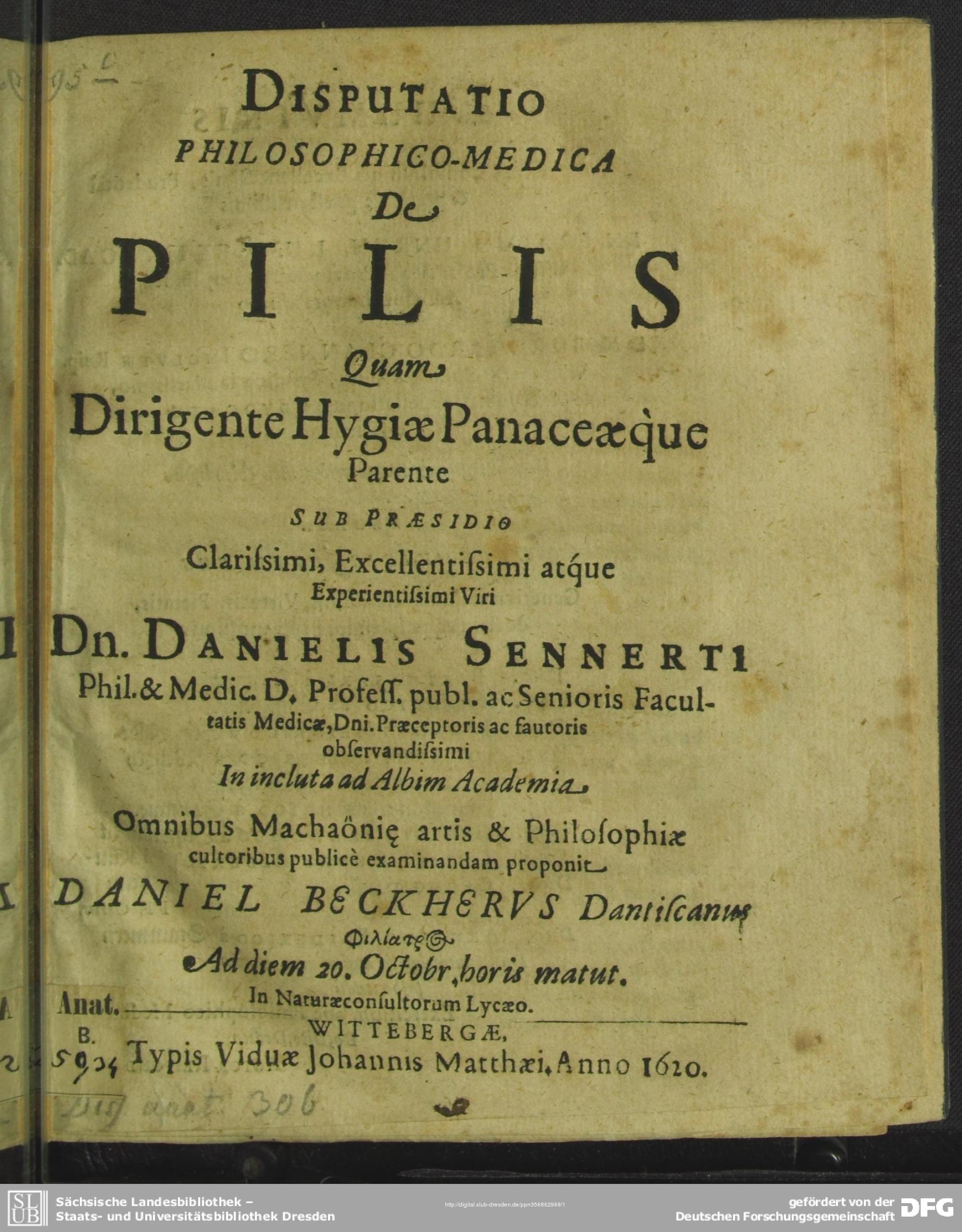 Disputatio Philosophico-Medica De Pilis / Quam ... Sub Praesidio ... Danielis Sennerti ... In incluta ad Albim Academia ... examinandam proponit Daniel Beckherus ... Ad diem 20. Octobr. ...