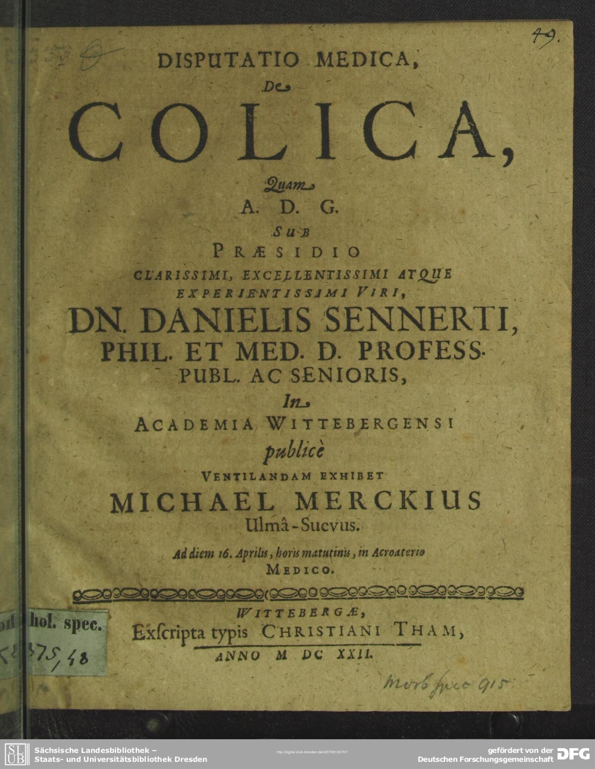 Disputatio Medica De Colica / Quam A. D. G. Sub Praesidio ... Dn. Danielis Sennerti, Phil. Et Med. D. Profess. ... In Academia Wittebergensi publice Ventilandam Exhibet Michael Merckius Ulma-Suevus. Ad diem 16. Aprilis ...