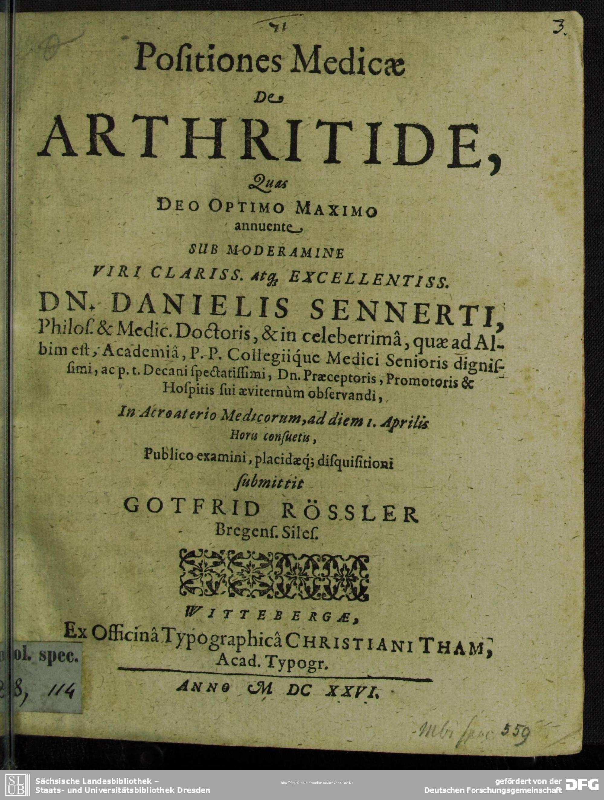 Positiones Medicae De Arthritide / Quas ... Sub Moderamine ... Dn. Danielis Sennerti, Philos. & Medic. Doctoris ... ad diem 1. Aprilis ... Publico examini, placidaeq[ue] disquisitioni submittit Gotfrid Rössler, Bregens. Siles.