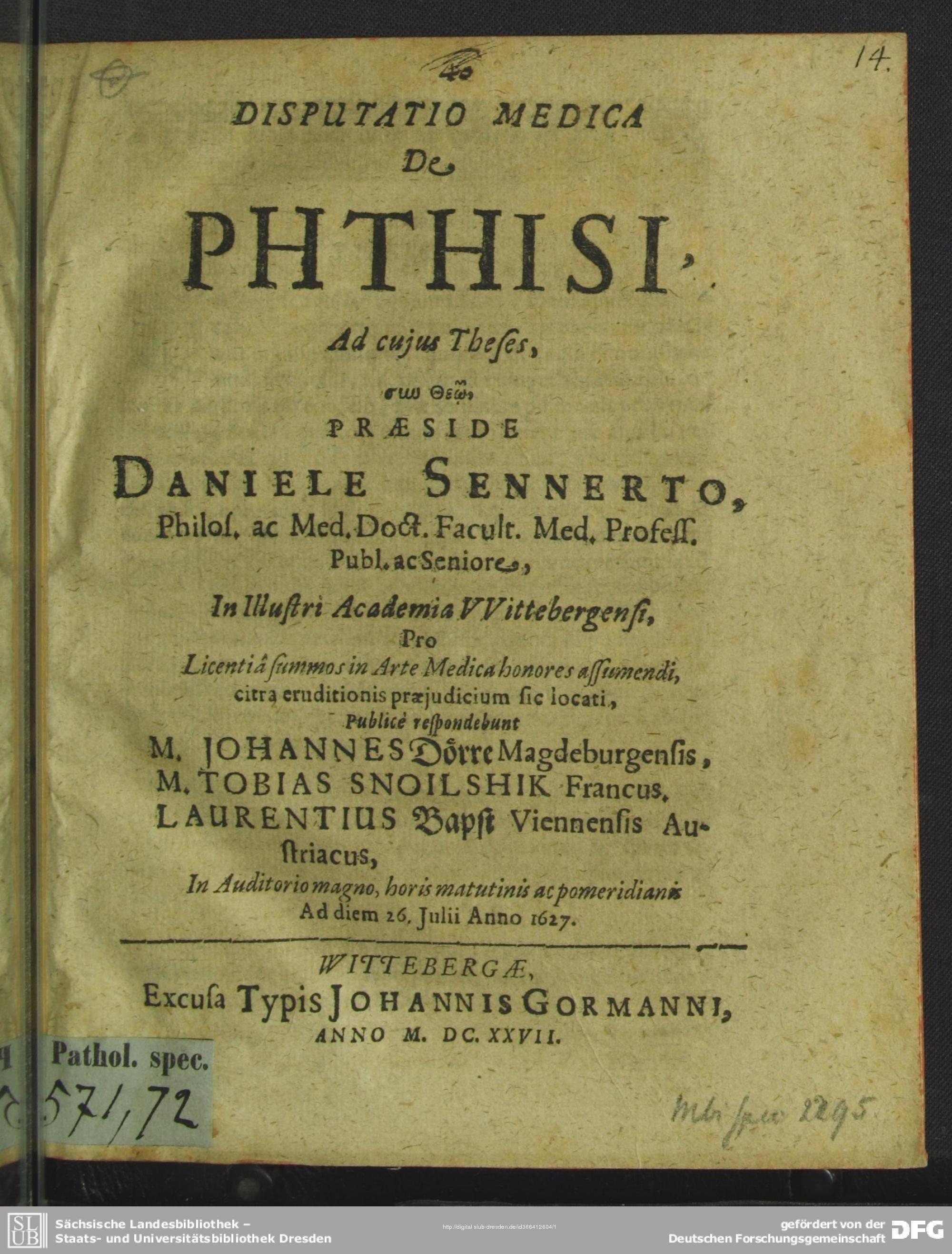 Disputatio Medica De Phthisi (1627)