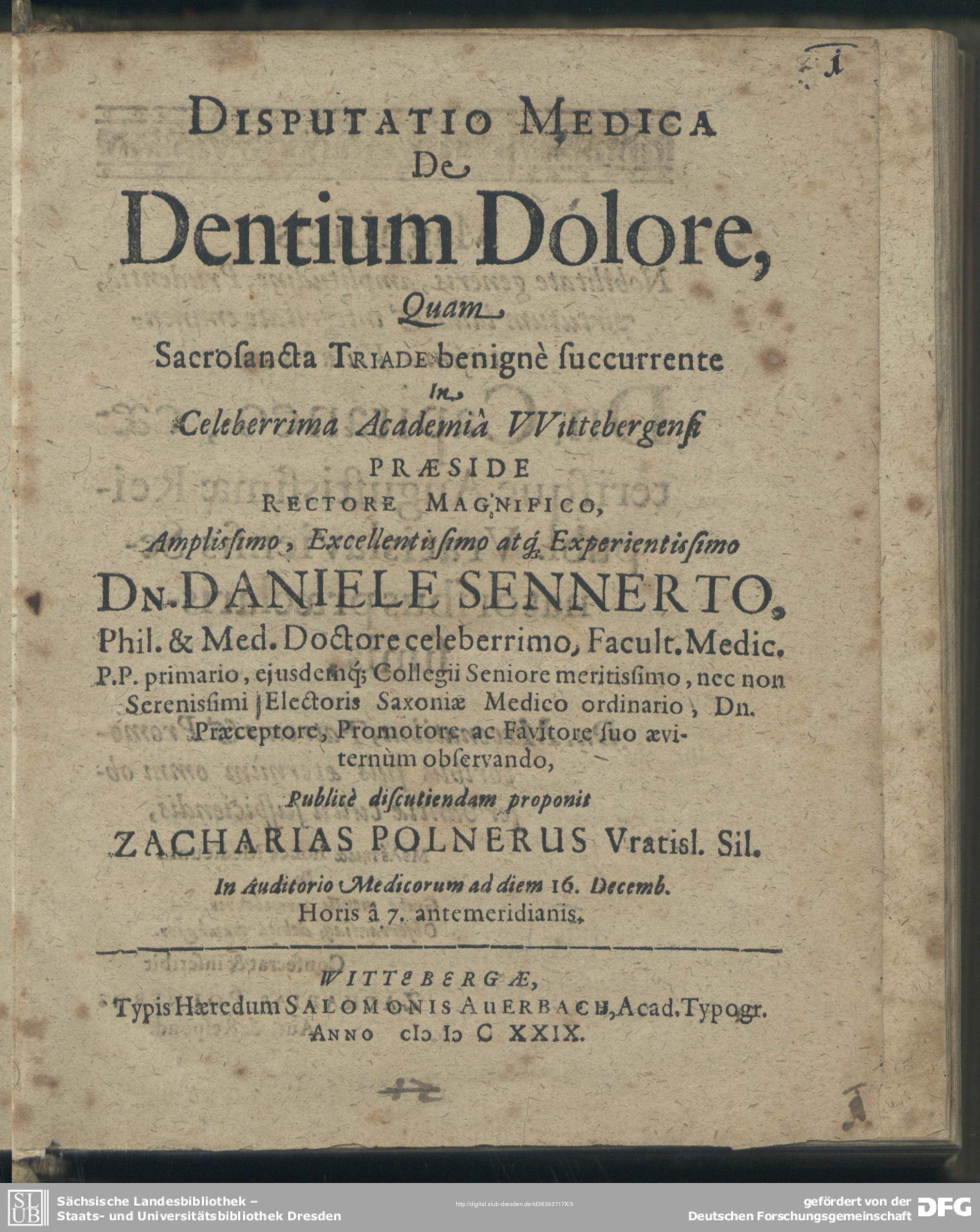 Disputatio Medica De Dentium Dolore / Quam ... In Celeberrima Academia Wittebergensi Praeside Rectore Magnifico ... Dn. Daniele Sennerto ... Publice discutiendam proponit Zacharias Polnerus Vratisl. Sil. In Auditorio Medicorum ad diem 16. Decemb. ...