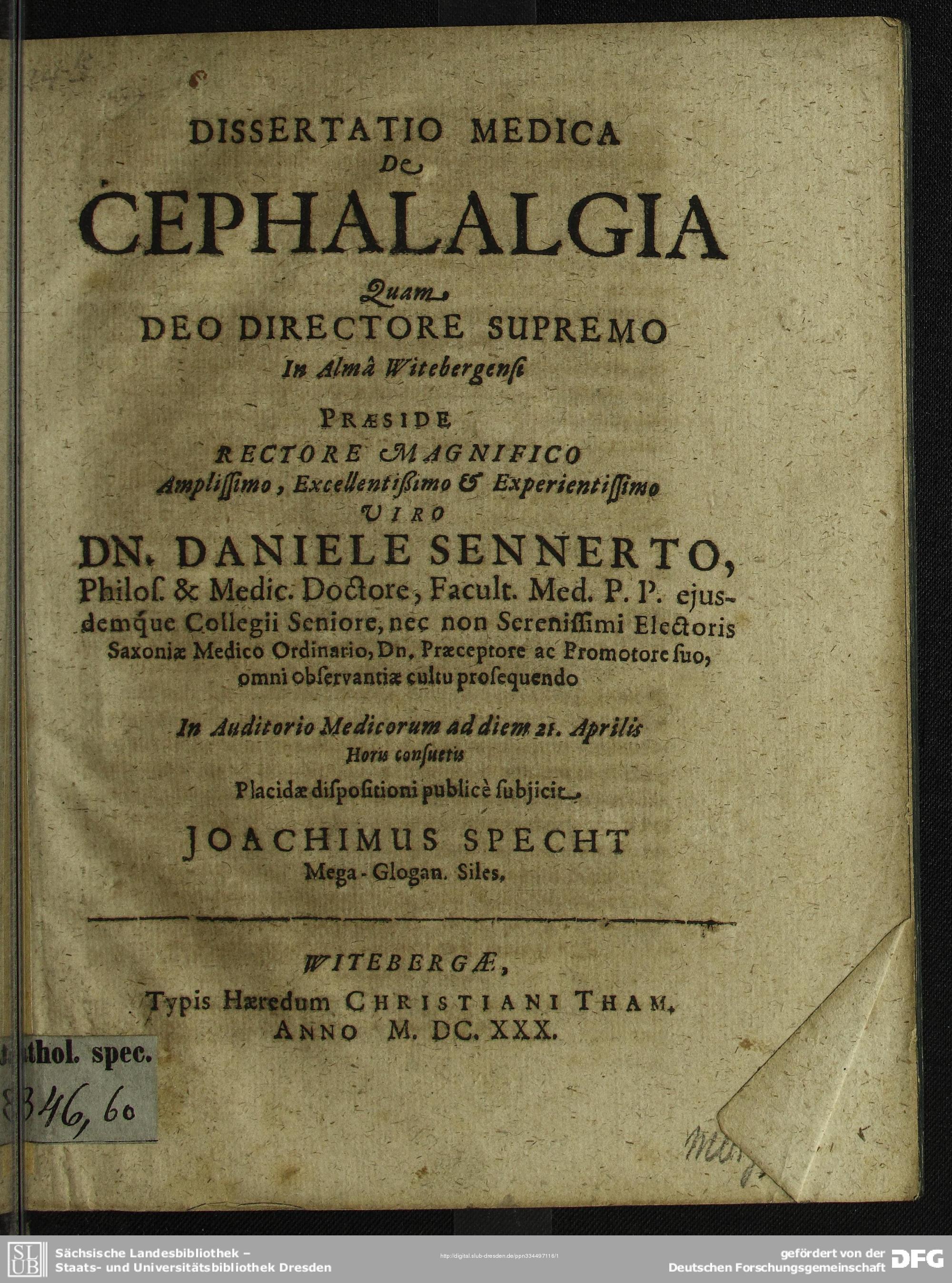 Disputatio Medica De Cephalalgia / Quam ... In Alma Witebergensi Praeside ... Dn. Daniele Sennerto ... In Auditorio Medicorum ad diem 21. Aprilis ... Placidae dispositioni publice subiicit Joachimus Specht Mega-Glogan. Siles.