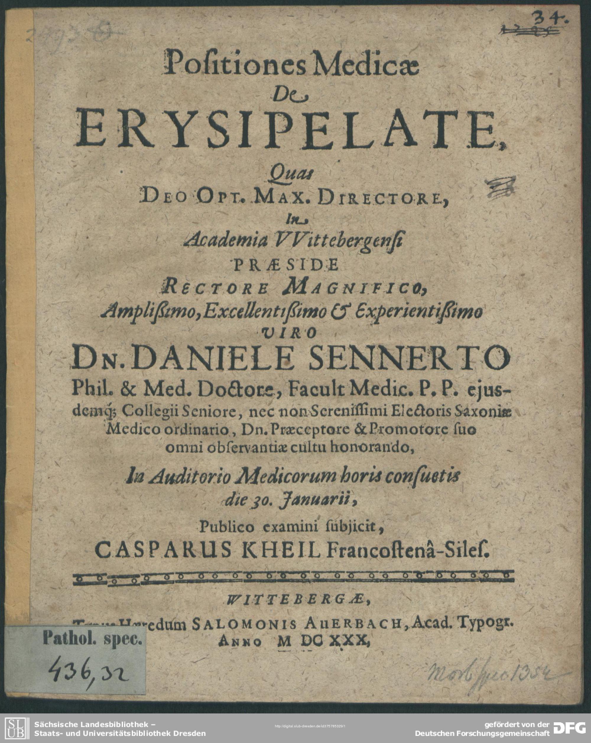 Positiones Medicae De Erysipelate / Quas ... In Academia Wittebergensi Praeside ... Dn. Daniele Sennerto Phil. & Med. Doctore ... die 30. Ianuarii, Publico examini subiicit, Casparus Kheil Francostena-Siles.
